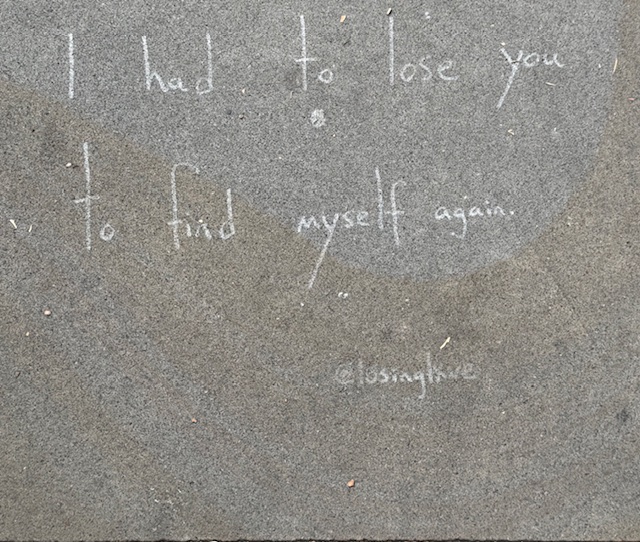 Sétáltam valamelyik nap az utcán. Általában mindenfele nézek, csak épp a lábam elé nem. Szerencsém volt. A csatolt szöveget láttam magam előtt, amely magyarra lefordítva kb. a következőt jelenti: „El kellett, hogy veszítselek azért, hogy önmagamat újra megtaláljam/megtalálhassam”.